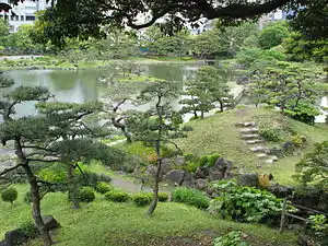 La superficie du jardin est de 43 070,53 m2. Il y a un chemin circulaire autour du bassin central Sensui (9 000 m2), qui est le cœur du jardin. À l'origine il s'agissait d'un étang d'eau salée, cependant, tandis que la terre autour est reprise sur la mer, l'étang est rempli d'eau douce. Le bassin comprend quatre îles, « Nakajima » la centrale et les plus petites « Ukishima », « Oshima » et « Yukimi-toro ». Deux ponts permettent le franchissement de l'étang par la plus grande île « Nakajima ». « Oshima » est proche de la berge et peut également être traversée. L'inspiration pour l'étang vient du lac de l'ouest dans le Hangzhou, et les rochers sur l'îlot central représentent les montagnes du lac de l'Ouest. Un coin de l'étang comprend une plage de sable appelée « Suhama », bien que la natation n'est pas recommandée.