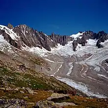 Le glacier de Talèfre dominé par l'aiguille de Triolet (à droite) et les Droites (à gauche) avec sur la gauche le refuge du Couvercle et derrière lui le Jardin de Talèfre.