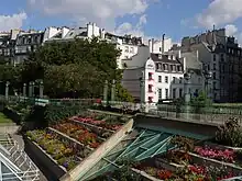 Plusieurs œuvres sont disposées dans le jardin. Sur la place René-Cassin, Écoute et Cadran solaire à fibres optiques d'Henri de Miller ; sur la rue Berger, Vizitor de Barry Flanagan.