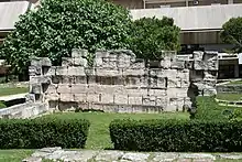 L'enclos conservé est décoré d'une alternance de métopes et de triglyphes qui reposent sur une plinthe. Au centre de cette terrasse a été découvert un socle de forme carrée en grand appareil de calcaire blanc : il pourrait s'agir de la base d'un autel ou d'une statue[12].