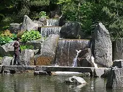 Les lignes directrices du paysage sont les horizontales et verticales des roches utilisées, renforcées par les parties pierres émergées qui forment un premier plan dans l'eau. Les éclaboussures de l'eau apportent une ambiance sonore apaisante. La chute d'eau est inspirée d'une chute d'eau présente au temple Tenryuji de Kyoto.