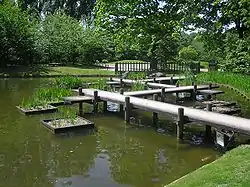 Le pont en zigzag dans le vivier est appelé Yatsuhashi. Il est toujours utilisé dans un « vivier à iris ». Les iris, selon l'usage japonais, sont plantés dans les étangs en mémoire d'un ami décédé.