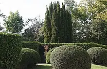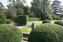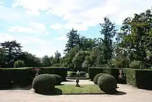 Le jardin régulier est resté tel qu’il figure sur le plan de jardin de 1919. Il comporte un bassin circulaire en pierre de Volvic avec un jet d'eau, et de grandes boules de buis taillés. Ces boules de buis ont été plantées vers 1919. Ce petit jardin régulier se prolonge vers la prairie naturelle[6]. Il est agrémenté de vases comportant des surfinias, choisis pour leurs fleurs abondantes et leur résistance aux pluies[7], et de lauriers roses.