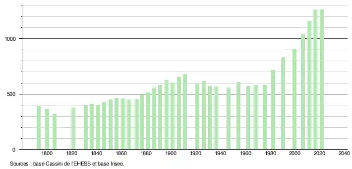 L'évolution du nombre d'habitants est connue à travers les recensements de la population effectués dans la commune depuis 1793. Pour les communes de moins de 10 000 habitants, une enquête de recensement portant sur toute la population est réalisée tous les cinq ans, les populations légales des années intermédiaires étant quant à elles estimées par interpolation ou extrapolation[26]. Pour la commune, le premier recensement exhaustif entrant dans le cadre du nouveau dispositif a été réalisé en 2006[27].