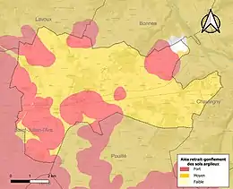 Les mouvements de terrains susceptibles de se produire sur la commune sont des tassements différentiels[16]. Le retrait-gonflement des sols argileux est susceptible d'engendrer des dommages importants aux bâtiments en cas d’alternance de périodes de sécheresse et de pluie[17]. 99,1 % de la superficie communale est en aléa moyen ou fort (79,5 % au niveau départemental et 48,5 % au niveau national)[Carte 2]. Depuis le , en application de la loi ÉLAN, différentes contraintes s'imposent aux vendeurs, maîtres d'ouvrages ou constructeurs de biens situés dans une zone classée en aléa moyen ou fort[Note 3],[18].