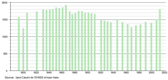 L'évolution du nombre d'habitants est connue à travers les recensements de la population effectués dans la commune depuis 1793. À partir du , les populations légales des communes sont publiées annuellement dans le cadre d'un recensement qui repose désormais sur une collecte d'information annuelle, concernant successivement tous les territoires communaux au cours d'une période de cinq ans. Pour les communes de moins de 10 000 habitants, une enquête de recensement portant sur toute la population est réalisée tous les cinq ans, les populations légales des années intermédiaires étant quant à elles estimées par interpolation ou extrapolation[10]. Pour la commune, le premier recensement exhaustif entrant dans le cadre du nouveau dispositif a été réalisé en 2007[11],[Note 1].