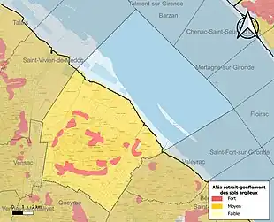 Le retrait-gonflement des sols argileux est susceptible d'engendrer des dommages importants aux bâtiments en cas d’alternance de périodes de sécheresse et de pluie. 51,1 % de la superficie communale est en aléa moyen ou fort (67,4 % au niveau départemental et 48,5 % au niveau national). Sur les 726 bâtiments dénombrés sur la commune en 2019, 726 sont en aléa moyen ou fort, soit 100 %, à comparer aux 84 % au niveau départemental et 54 % au niveau national. Une cartographie de l'exposition du territoire national au retrait gonflement des sols argileux est disponible sur le site du BRGM[21],[Carte 2].