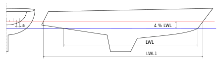 La mesure de , la longueur pour la jauge, est particulièrement importante. Cette longueur L est égale à 30 % de la longueur de flottaison plus 70 % de la longueur de la coque à 0,04.LWL au-dessus de la ligne de flottaison , éventuellement augmentée du quart du demi bau arrière à la même hauteur de 4 % de LWL (a). Cette valeur incite à dessiner des voiliers dont le tableau arrière est situé au-dessus de la ligne des 4 %.