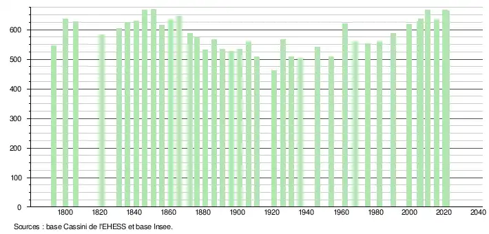 L'évolution du nombre d'habitants est connue à travers les recensements de la population effectués dans la commune depuis 1793. Pour les communes de moins de 10 000 habitants, une enquête de recensement portant sur toute la population est réalisée tous les cinq ans, les populations légales des années intermédiaires étant quant à elles estimées par interpolation ou extrapolation[23]. Pour la commune, le premier recensement exhaustif entrant dans le cadre du nouveau dispositif a été réalisé en 2005[24].