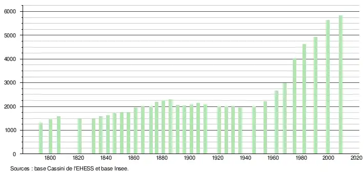 L'évolution du nombre d'habitants est connue à travers les recensements de la population effectués dans la commune depuis 1793. À partir du , les populations légales des communes sont publiées annuellement dans le cadre d'un recensement qui repose désormais sur une collecte d'information annuelle, concernant successivement tous les territoires communaux au cours d'une période de cinq ans. Pour les communes de moins de 10 000 habitants, une enquête de recensement portant sur toute la population est réalisée tous les cinq ans, les populations légales des années intermédiaires étant quant à elles estimées par interpolation ou extrapolation[13]. Pour la commune, le premier recensement exhaustif entrant dans le cadre du nouveau dispositif a été réalisé en 2008[14],[Note 1].