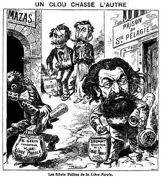 Chargé par un riche lecteur de la Semaine financière de placer entre 250 000 et 280 000 francs de titres, Gerin en a converti la majeure partie en valeurs non cotées en bourse et surévaluées, dont des actions de la Caisse de la Semaine financière. Après avoir vainement exigé que Gerin lui restitue une somme équivalente aux valeurs confiées, le client porte plainte. Inculpé d'abus de confiance, Gerin est arrêté par le commissaire Touny et écroué au dépôt puis à Mazas le 1er février 1893[24]. Cette incarcération précède de seulement deux jours la libération de Drumont, qui vient de purger à Sainte-Pélagie les trois mois de prison auxquels il avait été condamné pour avoir diffamé le député Auguste Burdeau. Ce chassé-croisé inspire au caricaturiste Pépin un dessin publié dans Le Grelot du 12 février. Libéré au bout d'une semaine, après le versement d'une caution par Odelin[29], Gerin semble avoir bénéficié d'un non-lieu sur cette affaire.