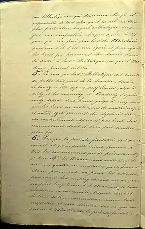 « Je veux que ladite bibliothèque soit ouverte au public trois jours de la semaine, savoir le lundi matin depuis neuf heures jusqu'à midy, et les mardy et vendredi l'après midy depuis deux heures jusqu'à cinq... »