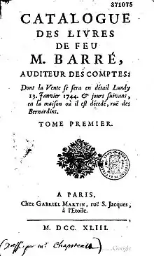 - Catalogue des livres de feu M. Barré, Auditeur des comptes, Paris : Gabriel Martin, 1743. Numérisé sur Google Books.