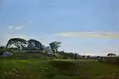 - La Halte, 1877. Ce tableau représente deux cavaliers faisant halte devant l'alignement de maisons où se trouvait une auberge et la chapelle — de nos jours disparues — du Petit-Guélen en Ergué-Armel[6] ;