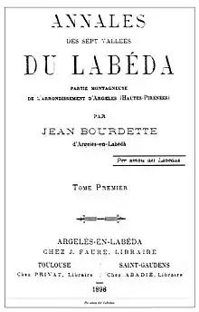 - Annales des Sept Vallées du Labédà. "Per amou det Labédà". Tome I. Un volume, 1898, 528 pp, 14x22,5 cm. In 8°.