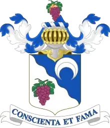 Écu : Tranché en onde d'azur et d'argent, au croissant renversé d'argent sur azur, et au raison de pourpre feuillé de sinople sur argent