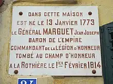 « De retour en France, il participe avec le grande armée aux principale campagnes. Il est à Austerlitz, Iéna (où il est blessé), puis direction l'Espagne. Il passera colonel pour sa brillante conduite au siège de Badajoz. En 1813, il est nommé baron de l'Empire, général de brigade, et commande un détachement de voltigeurs de la Garde impériale. L'Empire est aux abois, c'est la campagne de France. Dans la plaine champenoise, le 1er février 1814, l'empereur livre un combat désespéré à La Rothière: cent dix mille coalisés font face à trente mille jeunes recrues levées en toute hâte. Le déséquilibre est flagrant. À la tête des "Marie-Louise", Marguet stoppe net l'avance alliée. Ses jeunes troupes font merveille. »