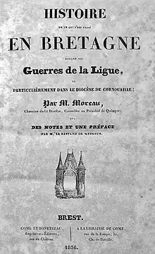 Page de titre de l'ouvrage du chanoine Jean Moreau sur les Guerres de la Ligue en Bretagne publié en 1836 par Le Bastard de Mesmeur.