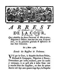 - Réhabilitation de Jean Peltier Dudoyer et François Michaud, AD 35, 1 Bf 1576, "arrêt sur rapport" en provenance de "La Grand-Chambre" du Parlement de Bretagne.