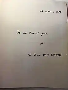 Jean van Lierde, Je ne tuerai pas, au Château Drese, réunion le 30 octobre 1957 - Jean Van Lierde; éd. Emile van Ceulen, 6 mois dans l'enfer d'une mine belge, Bruxelles, Service d'édition de la fédération bruxelloise de J.G.S., (réimpr. 1956 3e éd.), 23 p.