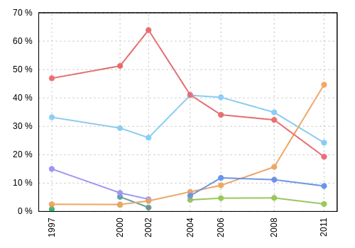 Légende: Les années en italiques représentent des élections partielles.