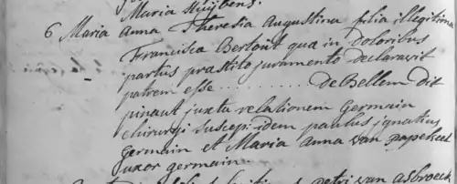 Elle entre, en 1753, au service de Monsieur de Quenonville[4], alors âgé de soixante ans. Veuf, il vit avec son fils et sa fille, il leur présente sous le nom de Mademoiselle de Bellem, une orpheline de bonne famille vivant dans la détresse[3]. Le 30 octobre 1766, à Bruxelles (Sainte-Gudule), un enfant de Marie Thérèse Augustine Josèphe De Bellem dite Pinaut, est baptisé sous le nom de Paul Ignace Guillaume Joseph Overbecque ou Overbeque ; le père étant, d'après les déclarations faites durant l'accouchement par la mère au chirurgien Paul Ignace Germain résidant rue de la Madeleine, un certain Guillaume François Overbeque, un homme célibataire comme le précisera l'acte d'inhumation de l'enfant. En effet, l'enfant ne vivra pas et fut inhumé (paroisse Sainte-Gudule), âgé de dix jours, le 11 novembre 1766. L'historien Frans van Kalken attribue la paternité de cet enfant au vicomte de Quenonville fils, qui portait les prénoms de Guillaume-François.
