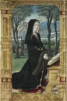 Portrait de Jeanne de Laval par Nicolas Froment, panneau droit du Diptyque des Matheron, vers 1475, Musée du Louvre. | |