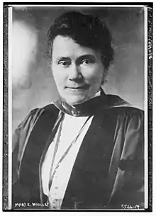 Mary Emma Woolley s'engage pour la paix de façon intense, en 1914, elle est une des fondatrices de la Church Peace League of America, en 1916 elle adhère à différentes organisations pacifistes : l'American League to Limit Armaments[58], le Boston Women's Peace Party, la Central Organization for Durable Peace (en) de La Haye, la Church Peace Union, la Peace Emergency Committee for Massachusetts et enfin elle est élue vice-présidente de la League to Enforce Peace (en). Face à l'entrée probable en guerre des États-Unis et les craintes de manque de ressources, Mary Emma Woolley est à l'initiative d'une alliance entre plusieurs établissements universitaires pour femmes le Mount Holyoke College, le Vassar College, le Wellesley College et le Smith College, association qui donnera naissance aux Sept Sœurs (universités)[59].