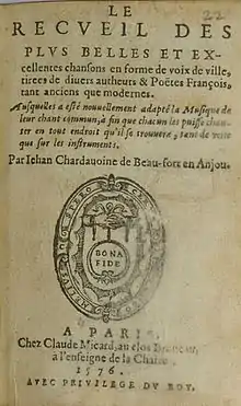 - Une réédition paraît chez Marc Loqueneux en 1588, partagée avec Claude Micard[4], in-16°, [6]-281-[1] p. Dans cette réédition, 44 pièces de l’édition de 1576 disparaissent, 25 sont nouvelles, et quelques airs sont modifiés. La préface est signée « M. A. C. », ce qui laisse supposer Chardavoine serait mort avant et a eu un continuateur, non identifié.