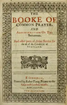 Depuis le début du XVIIe siècle, l'Église d'Écosse a le même fondement épiscopalien que sa cousine anglaise, mais est beaucoup plus puritaine, à fois dans la doctrine et dans la pratique. En 1633, le roi Charles Ier se rend à Saint-Gilles pour recevoir la couronne d'Écosse selon le rite anglican, accompagné par William Laud, nouvel Archevêque de Cantorbéry. Au cours des années suivantes, il cherche le moyen d'introduire la liturgie anglicane en Écosse, et nomme une commission pour rédiger un livre de prières utilisable en Écosse, et en 1637 est imprimé à Édimbourg :