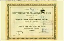 Les travaux commencent en . Lors du dépôt des statuts de la société (Société Anonyme de la Jetée-Promenade de Nice), le marquis cède son poste à un nouveau groupe présidé par le général de Jaugigny.