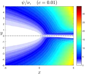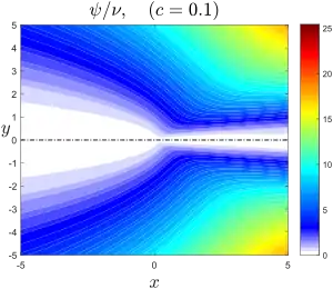 est reliée à la fonction de courant par . Ses contours se confondent donc avec celles-ci. Cette solution décrit l'écoulement entraîné en amont écarté de l'axe par la source dont l'intensité est donnée par la constante c qui s'interprète en termes de force volumique axiale[4]. Le « bord » du jet peut être défini par le point où les lignes de courant sont le plus près de l'axe, soit