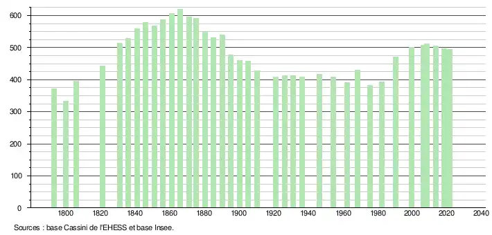 L'évolution du nombre d'habitants est connue à travers les recensements de la population effectués dans la commune depuis 1793. Pour les communes de moins de 10 000 habitants, une enquête de recensement portant sur toute la population est réalisée tous les cinq ans, les populations légales des années intermédiaires étant quant à elles estimées par interpolation ou extrapolation[17]. Pour la commune, le premier recensement exhaustif entrant dans le cadre du nouveau dispositif a été réalisé en 2008[18].
