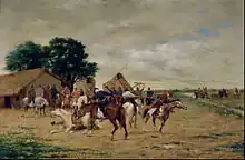 Des billets ont été émis par le propriétaire du jars, à cinquante cents chacun, à tous les messieurs présents qui le souhaitaient, et ils ont inscrit leur nom comme "tireurs". Les tireurs devaient s'élancer à une dizaine de mètres du jars, à cheval, à toute vitesse, et en passant sous le jars, ils avaient le privilège de lui arracher la tête - ce qui leur donnait droit au privilège supplémentaire de le manger...