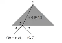 Cependant, seul le dernier équilibre de Nash satisfait à un concept d'équilibre plus restrictif, la perfection du sous-jeu. Le jeu ci-dessus peut être considéré comme ayant deux sous-jeux : le sous-jeu où le proposant fait une offre équitable, et le sous-jeu où le proposant fait une offre déloyale. Un équilibre de sous-jeu parfait se produit lorsqu'il existe des équilibres de Nash dans chaque sous-jeu, dont les joueurs ne sont pas incités à s'écarter. La théorie repose sur l'hypothèse que les joueurs sont rationnels et qu'ils maximisent leur utilité[8]. Ainsi, les deux premiers équilibres de Nash ci-dessus ne sont pas des sous-jeux parfaits : le répondant peut choisir une meilleure stratégie pour l'un des sous-jeux.