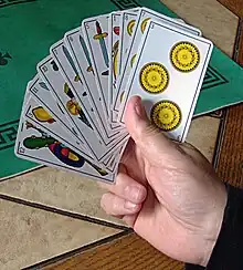 On utilise un jeu de 48 cartes aux enseignes espagnoles (deniers, coupes, épées et bâtons) avec 12 cartes pour chaque joueur.