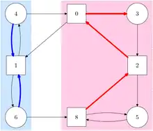 La figure ci-contre montre un graphe orienté à huit sommets. Le joueur 1 joue dans les sommets ronds et le joueur 2 joue dans les sommets carrés. Les numéros indiqués dans les sommets sont les couleurs. Par exemple, la couleur du sommet rond en haut à gauche est 4. Le joueur 1 gagne si la couleur la plus grande visitée une infinité de fois est paire. Ainsi, dans la zone bleue, le joueur 1 a une stratégie gagnante, donnée par les arcs en bleu. Si on part du sommet 1, un exemple de partie est 141416161414... et la couleur la plus grande visitée une infinité de fois est soit 4, soit 6, et est paire dans tous les cas.