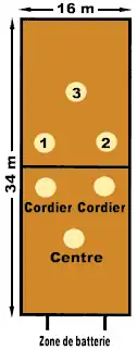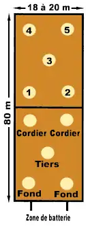- Le terrain en extérieur : un rectangle en terre battue, goudron ou synthétique (rare) de 80 m de long sur 18 m ou 20 m de large. Dans la longueur, le terrain est coupé en son milieu en deux camps par une ligne dénommée corde. Les lignes de limite de 10 cm de large font partie du terrain. En revanche, une balle qui touche la corde sera toujours jugée faute pour l'équipe qui vient de renvoyer la balle. La variante de ce sport en intérieur utilise un terrain de 34 m de long sur 16 m de large.