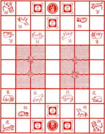 Le plateau de jeu est constitué de soixante-trois cases (sept colonnes et neuf lignes). Certaines cases sont spéciales : la tanière, située au milieu de la première ligne, les pièges, situés devant et de chaque côté de la tanière, et deux zones d'eau rectangulaires (2x3) appelées rivières, situées au milieu du plateau. Ces cases spéciales, ainsi que les cases de départ des différentes pièces, sont signalées comme telles par une inscription en chinois.