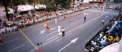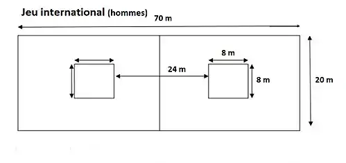 Le jeu international se joue sur une surface de béton rectangulaire et plane, dans un cadre de 70 × 20 mètrespour la catégorie masculine et de 50 × 14 mètres pour la catégorie féminine. Les extrémités de ce rectangle sont les lignes de service et de réception. Dans la zone de service un carré de 8 × 8 mètres (pour les hommes) ou de 6 × 6 mètres (pour les femmes) est appelée zone de service[1].