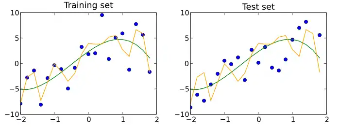 Un jeu de données de test est un jeu de données indépendant du jeu de données d'apprentissage, mais qui suit la même distribution de probabilité que le jeu de données d'apprentissage. Si un modèle ajusté au jeu de données d'apprentissage s'adapte également bien au jeu de données de test, un surajustement minimal a eu lieu (voir la figure ci-dessous). Un meilleur ajustement du jeu de données d'apprentissage par opposition au jeu de données de test indique généralement un surajustement.