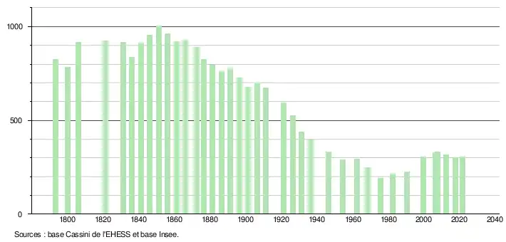 L'évolution du nombre d'habitants est connue à travers les recensements de la population effectués dans la commune depuis 1793. Pour les communes de moins de 10 000 habitants, une enquête de recensement portant sur toute la population est réalisée tous les cinq ans, les populations légales des années intermédiaires étant quant à elles estimées par interpolation ou extrapolation[19]. Pour la commune, le premier recensement exhaustif entrant dans le cadre du nouveau dispositif a été réalisé en 2007[20].
