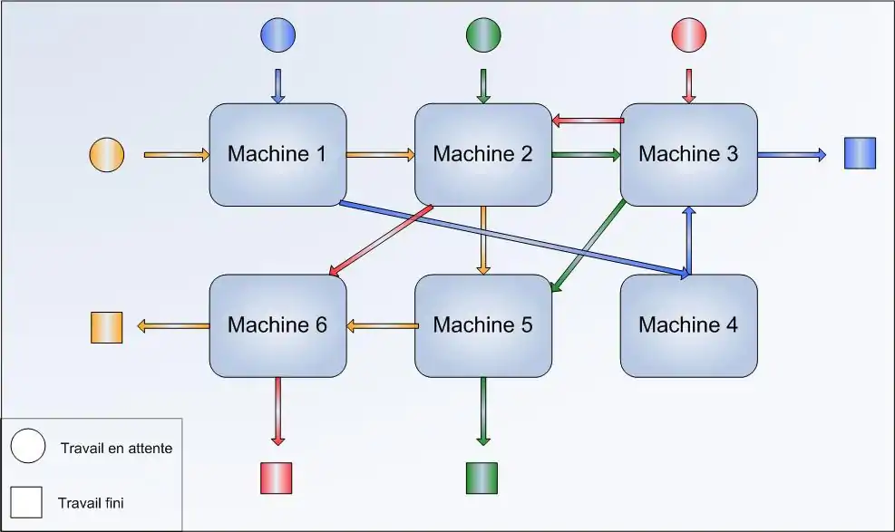 - le nombre de solutions possibles est de l’ordre de (n!)m, où n est le nombre de tâches à effectuer et m le nombre de machines. Notons qu’une tâche veut dire la même chose qu’un travail.