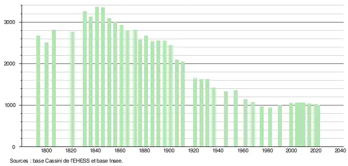 L'évolution du nombre d'habitants est connue à travers les recensements de la population effectués dans la commune depuis 1793. Pour les communes de moins de 10 000 habitants, une enquête de recensement portant sur toute la population est réalisée tous les cinq ans, les populations légales des années intermédiaires étant quant à elles estimées par interpolation ou extrapolation[26]. Pour la commune, le premier recensement exhaustif entrant dans le cadre du nouveau dispositif a été réalisé en 2004[27].