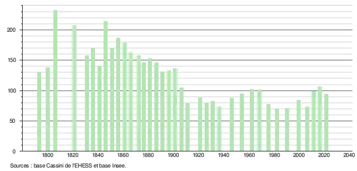 L'évolution du nombre d'habitants est connue à travers les recensements de la population effectués dans la commune depuis 1793. Pour les communes de moins de 10 000 habitants, une enquête de recensement portant sur toute la population est réalisée tous les cinq ans, les populations légales des années intermédiaires étant quant à elles estimées par interpolation ou extrapolation[27]. Pour la commune, le premier recensement exhaustif entrant dans le cadre du nouveau dispositif a été réalisé en 2006[28].