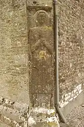 - Église Saint-Vigor en grande partie du XIIIe siècle[32], refaite au XVIIe siècle avec son portail de style roman et des pierres placées en épis dans le mur de la nef indiquent l'art roman du XIIe siècle. Elle abrite deux gisants (XIIIe) repositionnés debout scellés sur les contreforts de la façade, dont un chevalier en cotte de mailles classés en 1914 au titre objet aux monuments historiques[33], la cloche Henriette, portant inscription, armoiries et Vierge à l'Enfant, classée en 1977[34], ainsi qu'un autel (XVIIe), les statues Vierge à l'Enfant (XIXe) et saint Joseph. À l'extérieur, dans une niche de l'église, dans le pignon du transept, statue de la Vierge à l'Enfant mutilée.