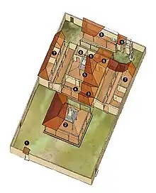 L'omah est agencé à l'aide de panneaux amovibles (qui peuvent être en bois). À l'avant, l'emperan est une semi-véranda servant aux activités publiques[4]. Une porte ornée mène au dalem, la pièce centrale. Celle-ci étant la plus intérieure, elle est plutôt sombre, coupée de la lumière extérieure. C'est là que la famille dort. À l'arrière, on trouve le senthong composé de trois petites pièces. La pièce à l'est sert à ranger le matériel agricole. Celle de l'ouest sert à stocker le riz. La pièce centrale est celle où l'on brûle l'encens pour les cérémonies en hommage à Sri, la déesse du riz.