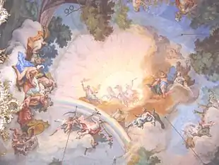 Sa peinture de plafonds se distingue des autres réalisations de l'époque essentiellement par le fait qu'il se détourne de la peinture illusionniste des fausses architectures.