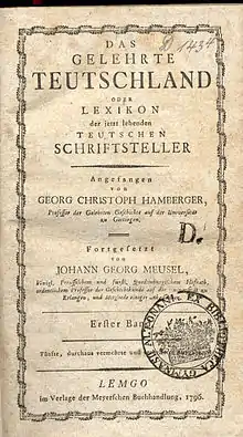 - Das gelehrte Teutschland oder Lexikon der jetzt lebenden teutschen Schriftsteller. Dictionnaire bibliographique de tous les auteurs vivants nés en Allemagne ou qui habitent ce pays, avec la liste exacte de tous ouvrages en quelque langue que ce soit. Meusel commence par un supplément à l’ouvrage publié par Hamberger sous le même titre. Les titres des livres s’y trouvent dans leur entier, tant de ceux qui ont paru séparément que de ceux qui sont insérés dans quelques-uns de ces recueils périodiques si multipliés en Allemagne; et chaque article commence par une courte notice sur l’auteur qu’il concerne. La troisième édition, en 1776-1778, est encore un ouvrage de Hamberger, mais à partir de 1796, l’œuvre en 16 volumes appartient entièrement à Meusel. L'ouvrage atteint, à la mort de Meusel en 1820, 23 volumes, et paraît en cinq éditions jusqu'en 1834. Le nombre total des auteurs vivants compris dans ce dictionnaire ou morts depuis l’impression du 1er volume est de 10648[3]. Éditions numérisés accessibles sur Wikisource.