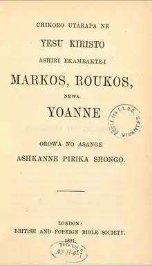 - 1891, Chikoro Utarapa ne Yesu Kiristo ashiri ekambakte-i Markos, Roukos, newa Yoanine orowa no asange ashkanne pirika shongo (The New Promise of Our Lord Jesus Christ, the Pure Good News Handed Down to us from Mark, Luke, and John), Londres.